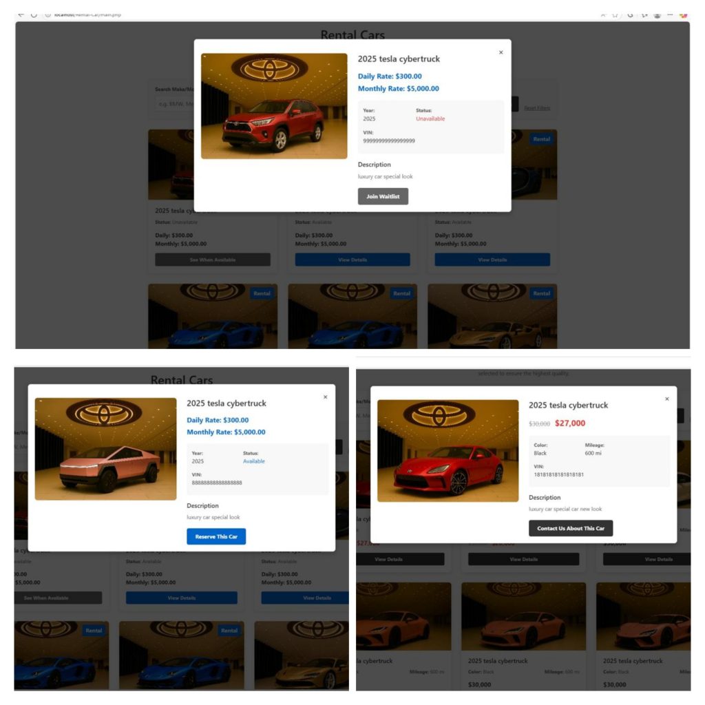 • تأجير السيارات: يقوم المسؤول بإدخال بيانات السيارات وأسعارها. يمكن للمستخدم تقديم استفسار أو طلب تأجير، ويتم التعامل معه من قِبل الدعم. يمكن إخفاء السيارات المعروضة بحسب توفرها.