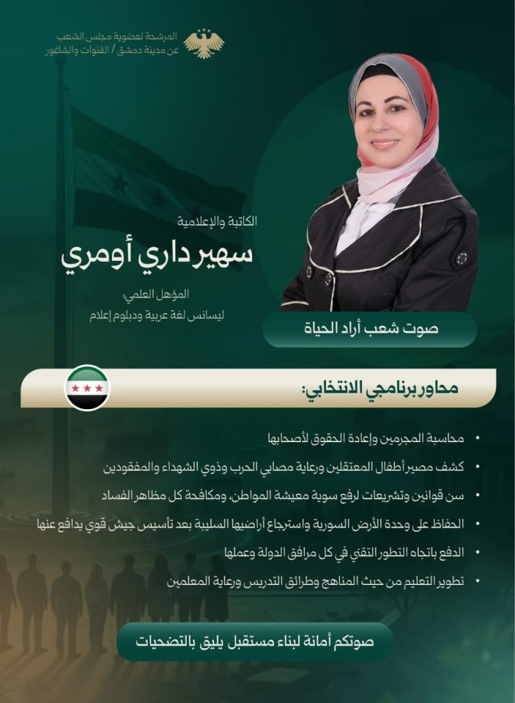 المرشحة”سهير اومري” انتخابات مجلس الشعب مناسبة عظيمة لكل من عاش حلم الحرية لسوريا